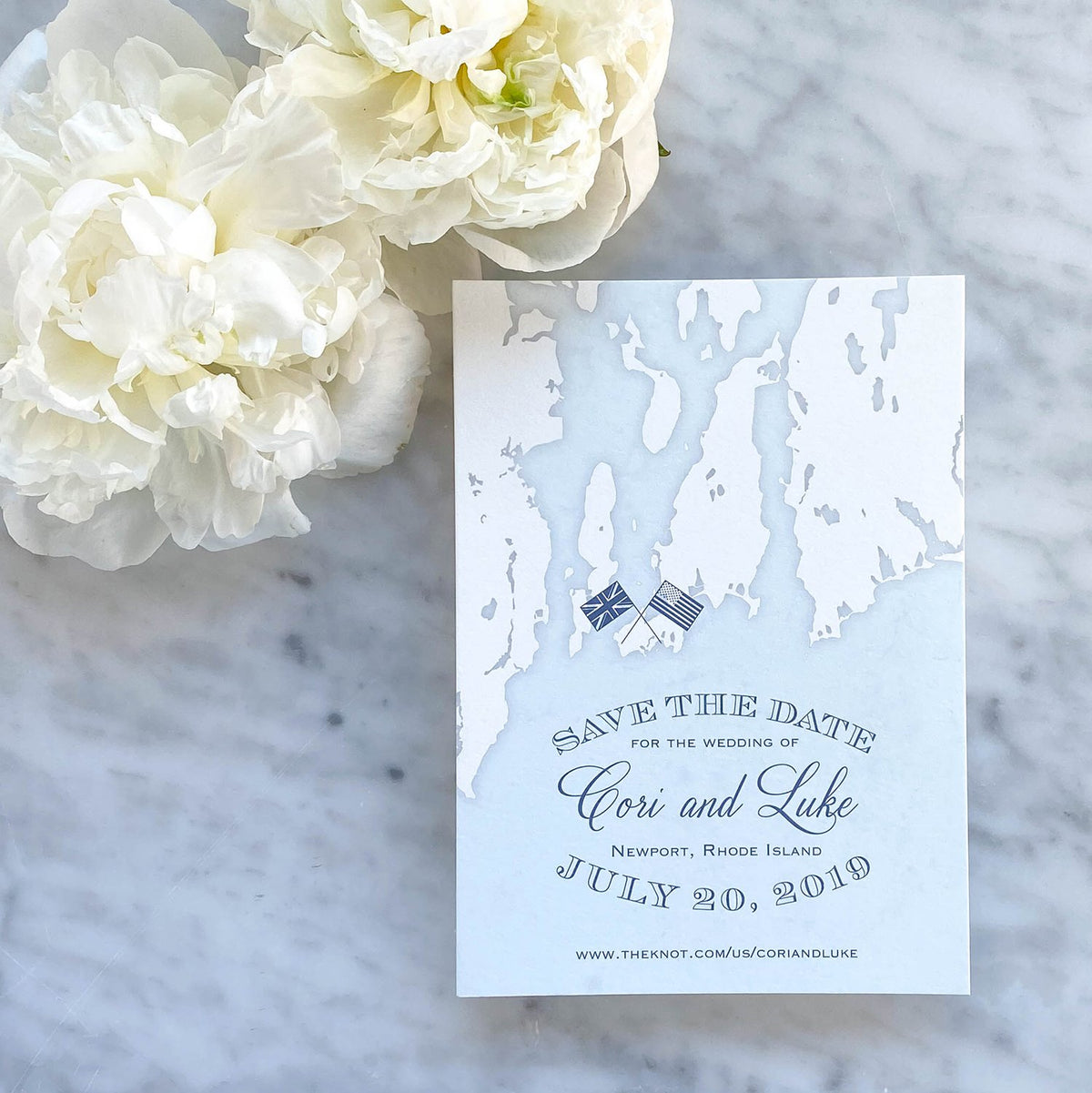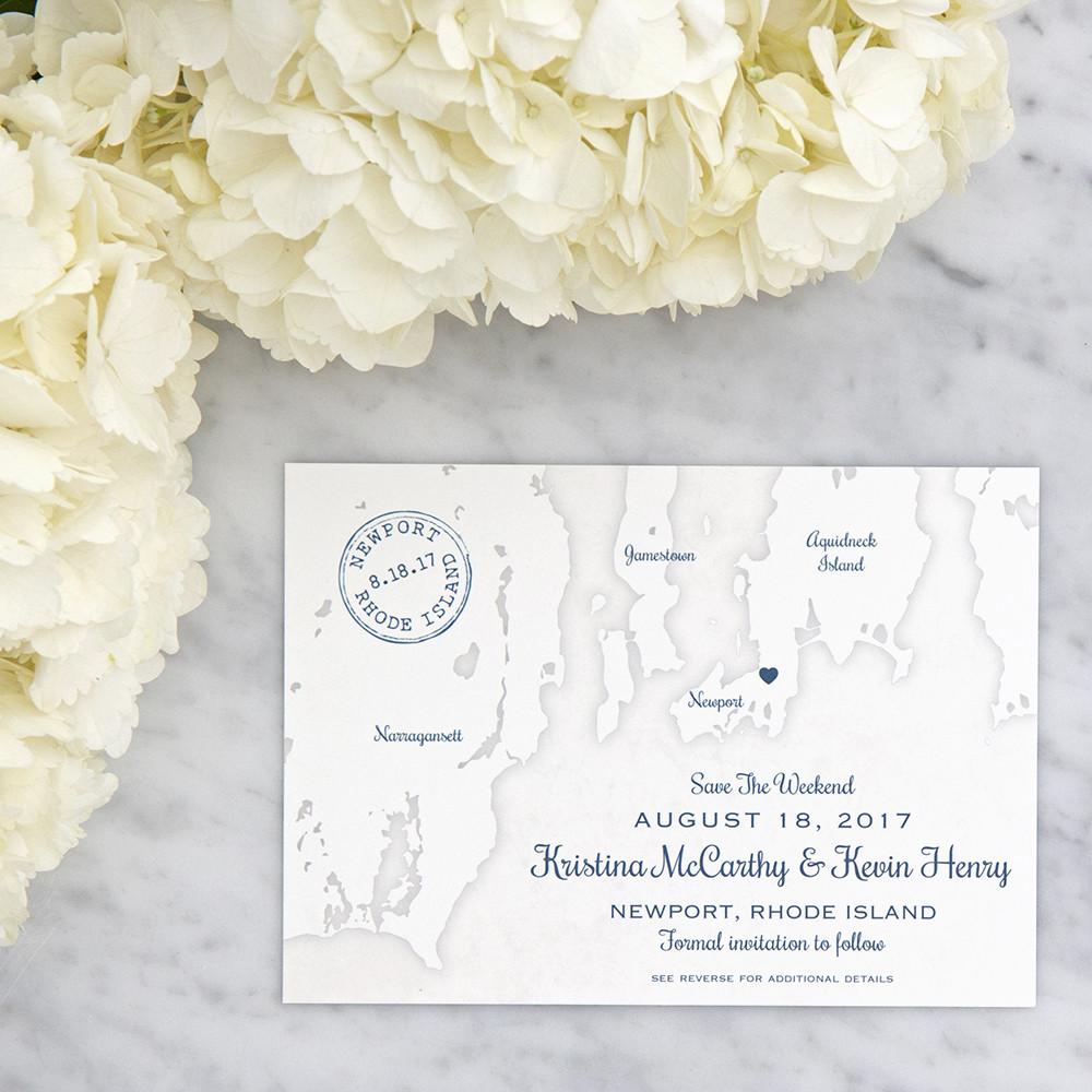 Our Rhode Island Map Save the Date features an outline of the area around Newport, Rhode Island.
