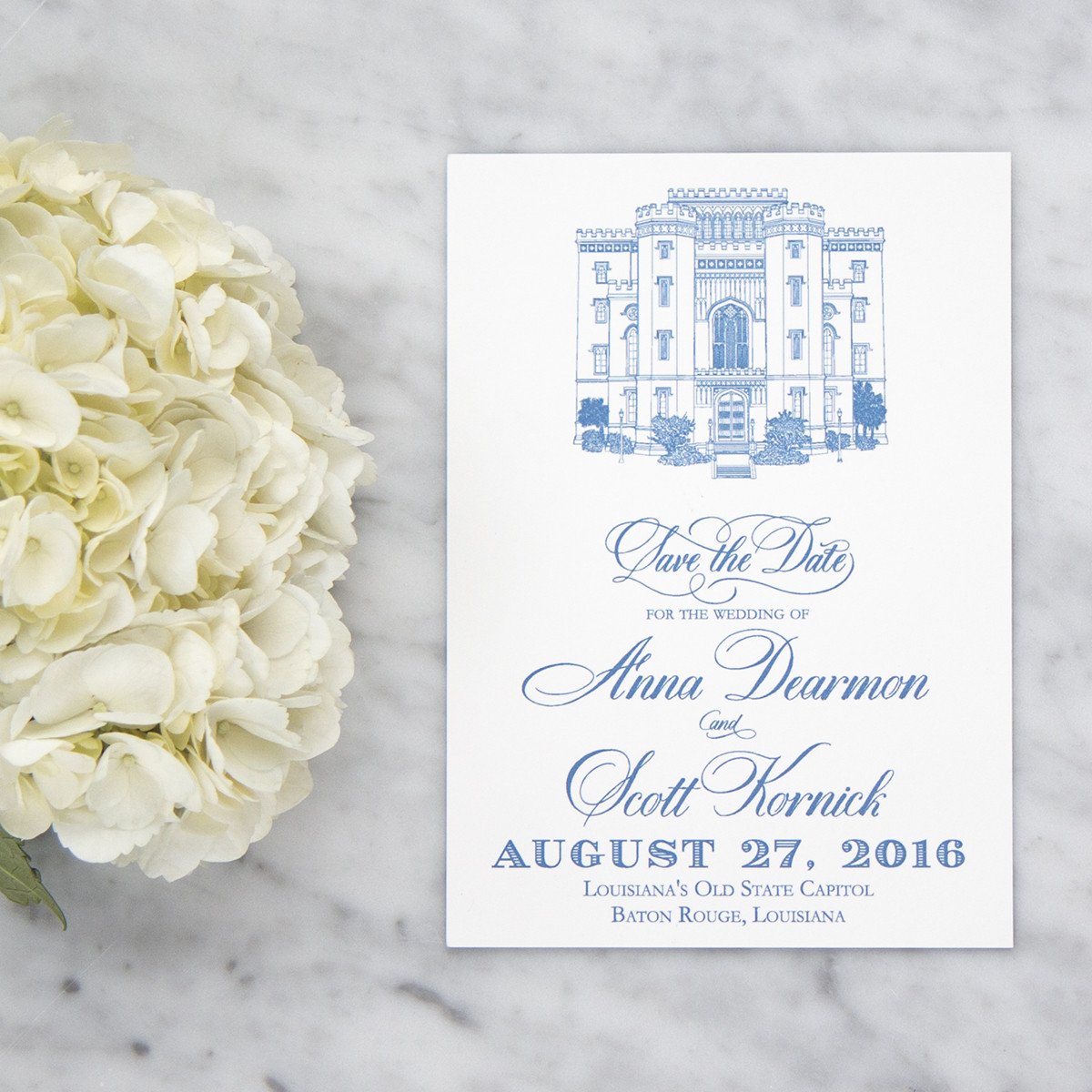 This save the date features a sketch of Louisiana's Old State Capitol in Baton Rouge, Louisiana.