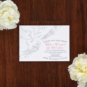 Our Charleston Outline Map Wedding Invitation features a map outline of the Charleston area.