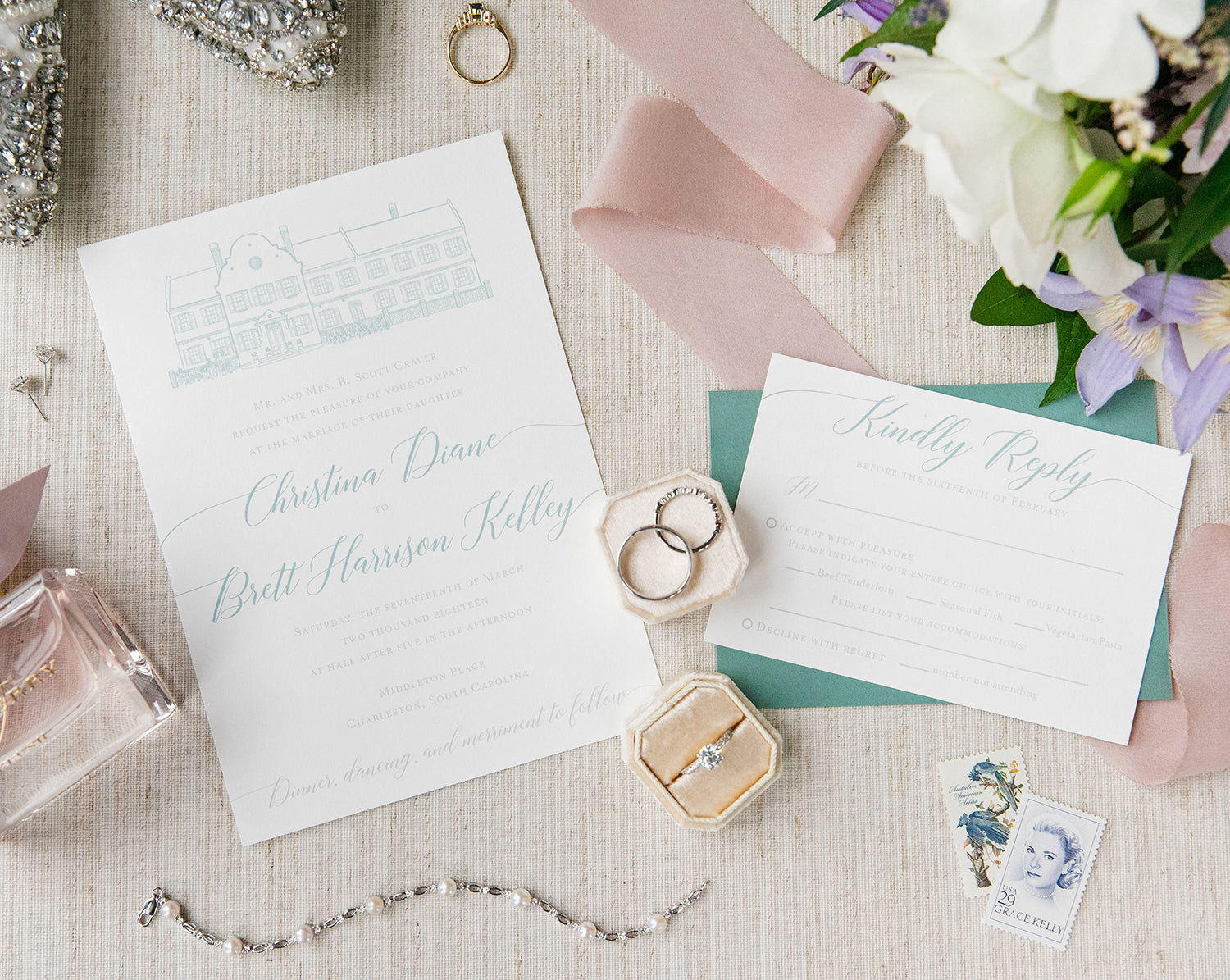 This wedding invitation features a sketch of the Middleton Place in Charleston, South Carolina.